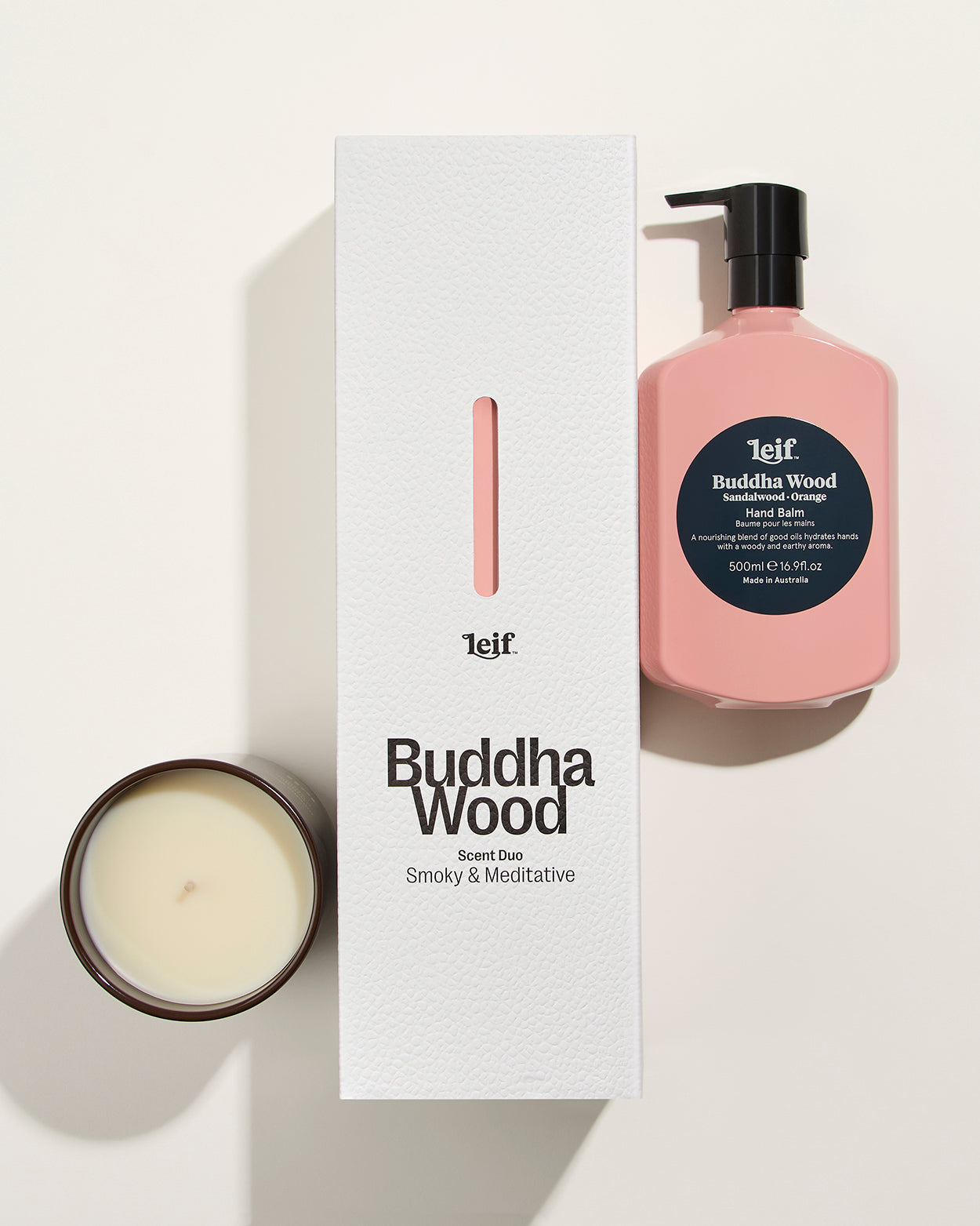 This gift set includes Buddha Wood Hand Balm 500mL and Candle 280g, presented in a beautifully minimalist, recyclable box featuring FSC-certified materials.