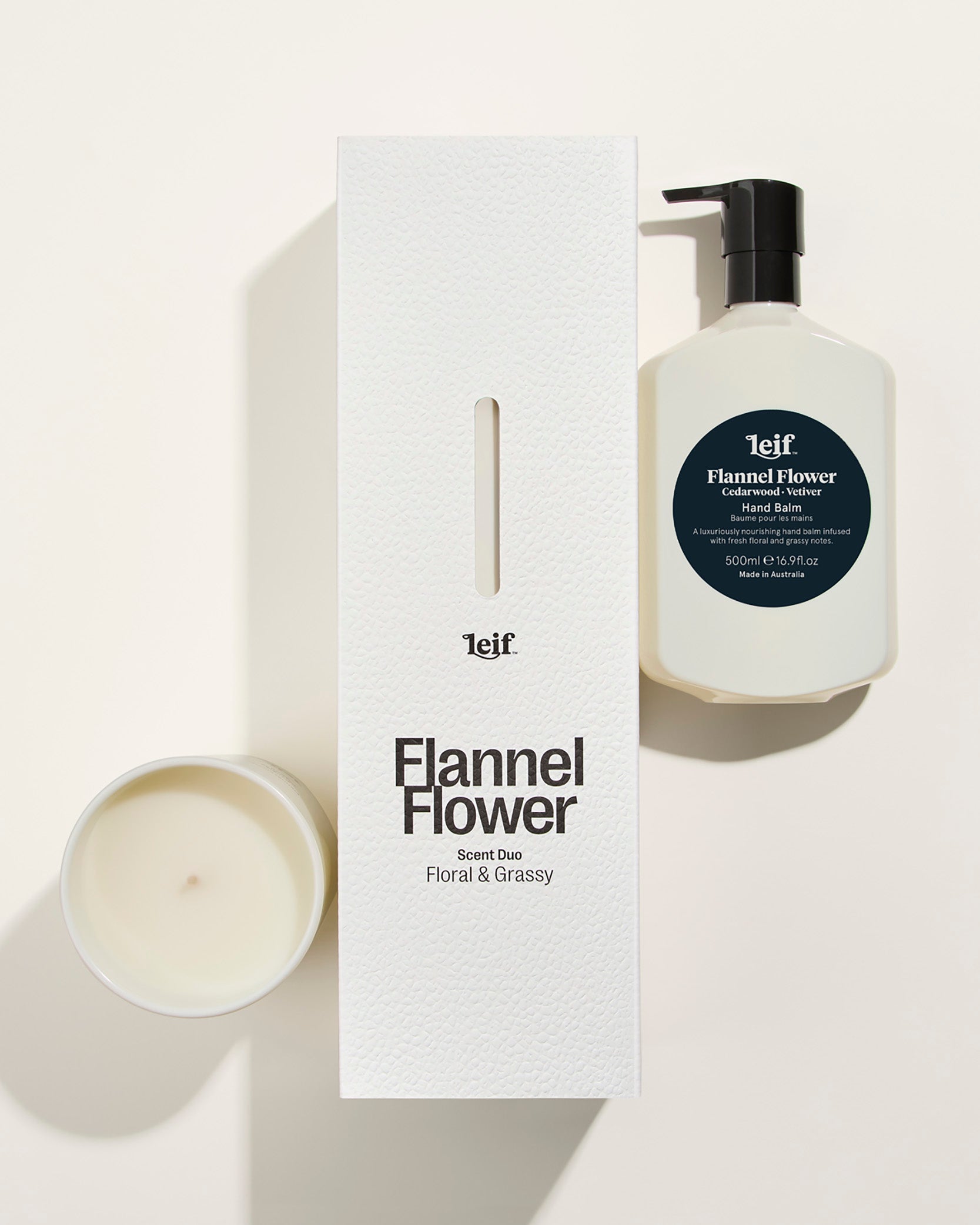 This gift set ties together Flannel Flower Hand Balm 500mL and Candle 280g, presented in a beautifully minimalist, recyclable box featuring FSC-certified materials.